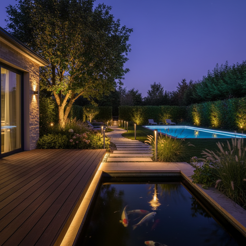 • Impianti di Illuminazione: La luce trasforma il giardino dopo il tramonto. Progettiamo scenari luminosi che esaltano i volumi architettonici e le essenze arboree, garantendo sicurezza e un’atmosfera suggestiva con sistemi a basso consumo.